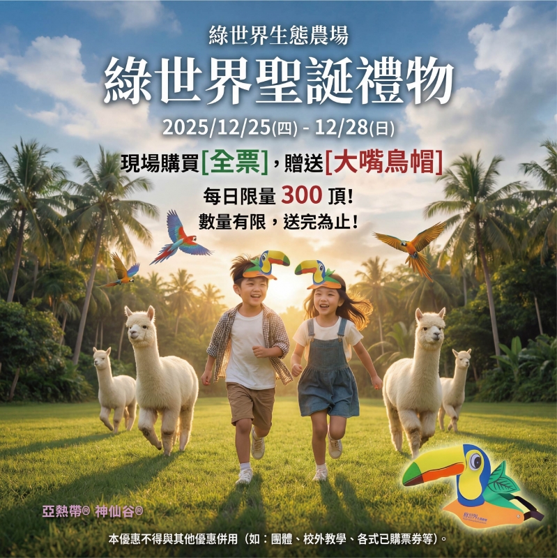 ???? 綠世界聖誕禮物,現場購全票就送「大嘴鳥帽」啦!2025/12/25-12/28✨